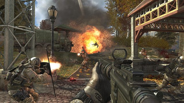 Then you hear the WHUPWHUPWHUP of rotors overhead, and your exquisite view is obscured by smoke from a nearby grenade. Sorry, pal, you’re not on vacation – you’re in the thick of the conflict, because you’re in Piazza, one of the two new Modern Warfare 3 multiplayer maps that are reaching Call of Duty Elite premium members today via the PlayStation Network. Now it’s a little slice of paramilitary paradise.