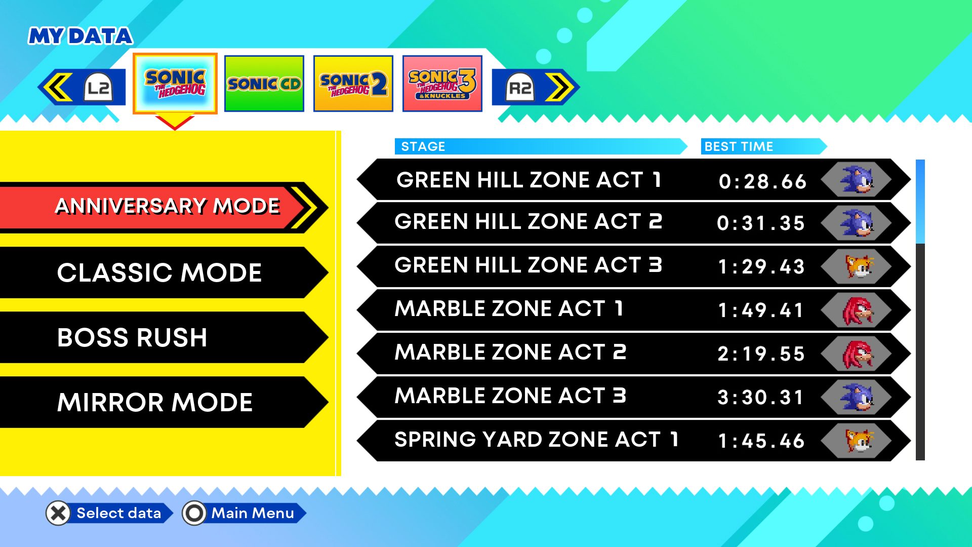 In “Anniversary Mode”, you can choose from your favorite characters and play as Sonic, Tails, or Knuckles.