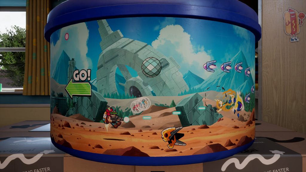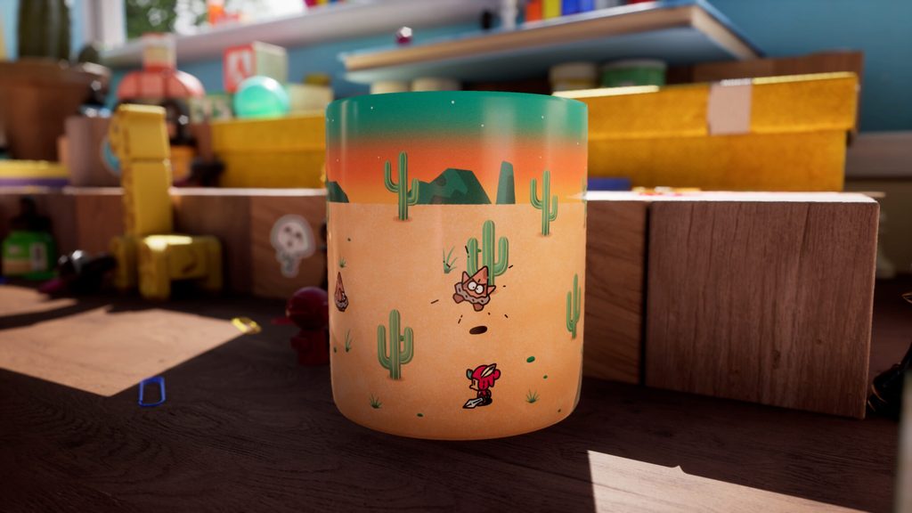 He must explore this new realm to find items that might help him in the battle against the nefarious Humgrump. During his excursions on this desk, Jot will fight huge beetles, jump inside illustrations, and even jetpack through the air.