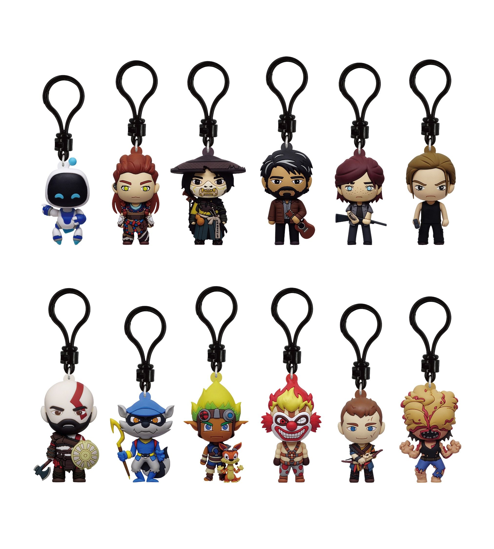 A set of detailed figural backpack clips celebrating fan-favorite PlayStation characters, perfect for collecting or showing off on the go.